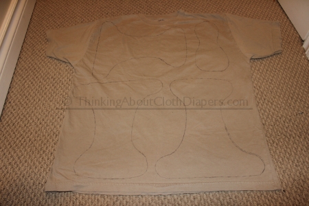 I've found it's best to run the pattern the same direction as the knit (i.e., like the 2 bodies of the diapers at the bottom of the t-shirt), rather than like the one that lays horizontal (like the one at the top) - this allows for better stretchiness in the diaper. You can cut 2 full diapers from 2 t-shirts if you lay 4 soaker patterns vertically across the top of the shirt near the neckline, and 2 bodies at the bottom.