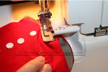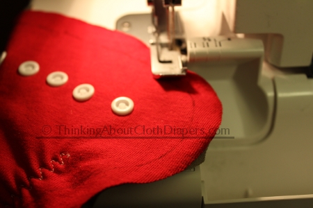 Before we actually start serging, it is important to place the belly snaps. While some fitted diaper makers place the snaps through all of the layers of material, for newborn diapers I prefer to put them only through the outer 2 layers so that the back of the snaps do not rub against baby's sensitive tummy.