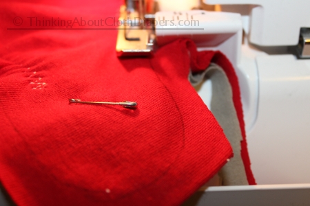 If you've kept your safety pins back far enough from the stitching lines, you can take them out when you're finished serging, but I feel better removing them just before I get to them!