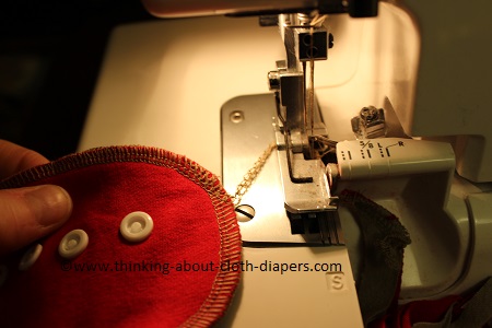 Now, we begin to serge around the diaper. You can use either a matching or a contrasting set of threads in your serger, or experiment with different colours of thread in the loopers than the needles. Variegated thread also adds a neat effect, especially for diapers made from old white t-shirts!