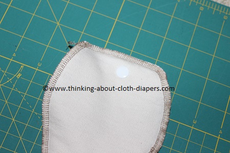 The image below shows the snap stud in place for the umbilical snap-down. Please note: We will NOT be adding the upper socket snap for the umbilical cord snap-down until the diaper is almost complete - the reason why is because if we added it now, it would be in the way of the serger stitches!