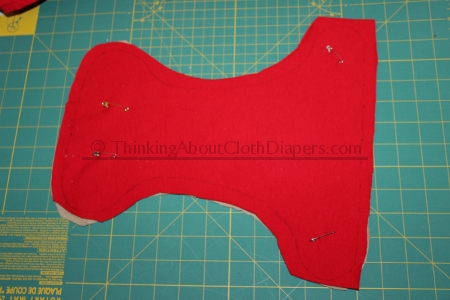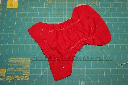 If you aren't good at serging around corners, you'll want to practice before you start your diaper (or plan to make a few extra less-than-perfect diapers!) The tight curves on diapers take some practice to feed evenly through the serger - I find that it's good to remember to move the fabric in front of the knife, rather than pulling the fabric away from the back where the stitching is happening.