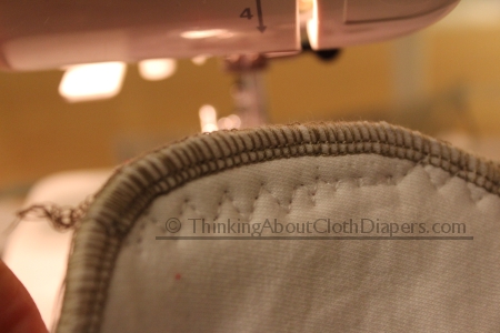 This step is completed using a wide or multi-stitch zig-zag on your sewing machine, back-stitching at the start and stop to lock the threads. Be sure to keep the stitching in at least an inch from the trim line on the diaper so that your elastic doesn't get caught by the serger needles or knife later!