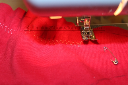 Here is a picture of the diaper with all of the elastic stitched in place. We will now be moving the remaining work over to the serger!
