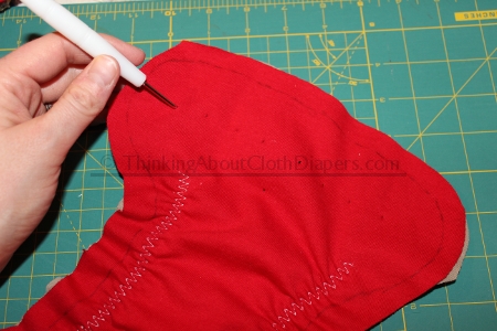 The final step is to add the wing snaps to the diaper. Using an awl, poke through all 4 layers of fabric as marked on your diaper pattern. The wing snaps use stud snaps.
