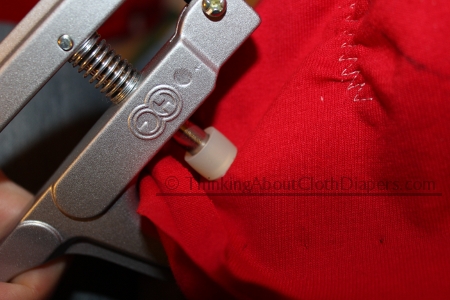 Because I don't make a lot of diapers, I've purchased an inexpensive pair of snap pliers, rather than a snap press. I like to use Size 20 KAM snaps throughout my entire diaper. For an introduction to snaps, check out the Beginner's Guide on KAM Snaps website.